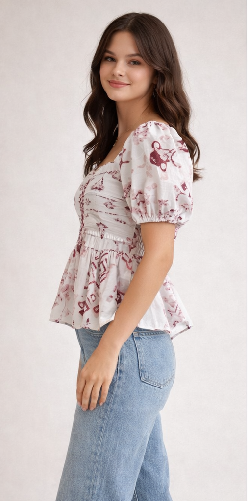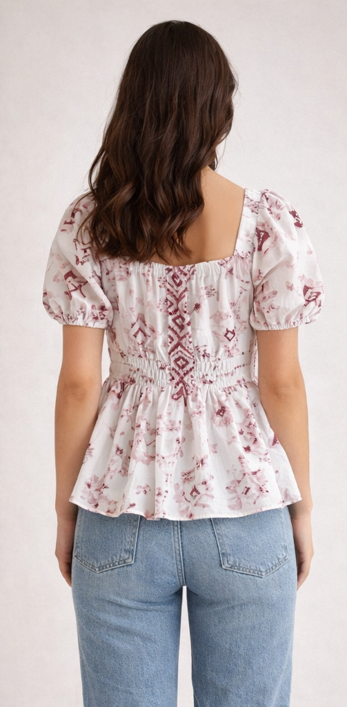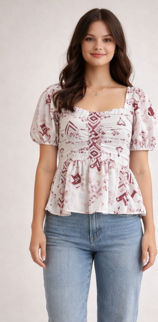 Upgrade your wardrobe with this stylish white and maroon printed peplum top. Featuring puff sleeves and a flattering flared hem, this design merges seamless comfort with boho chic aesthetics, making it a versatile choice for casual outings or everyday wear.